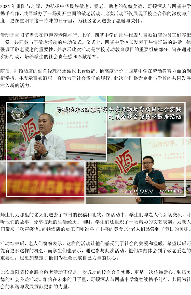 哥顿酒店&四基中学劳动教育项目——重阳节校企联合敬老活动圆满成功