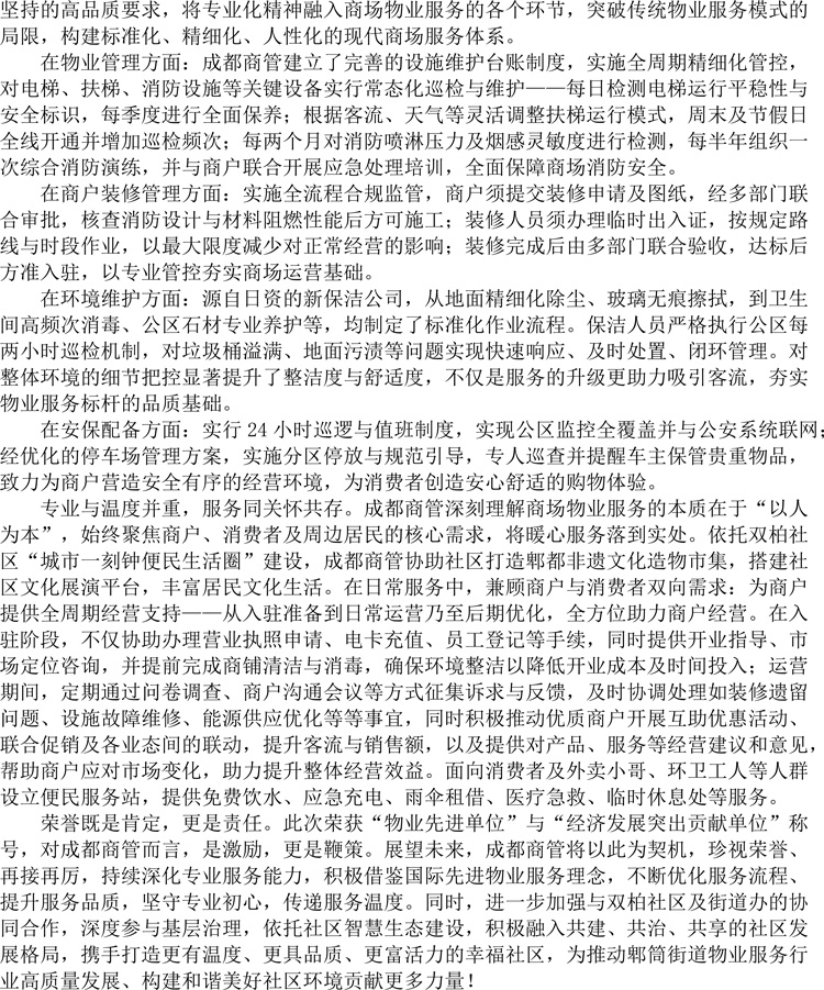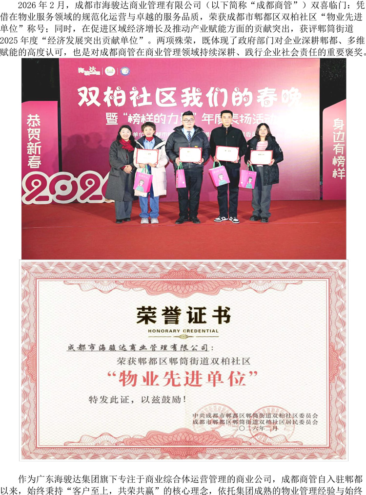 成都海骏达商业管理荣膺郫都区物业服务标杆与经济发展贡献两大奖项