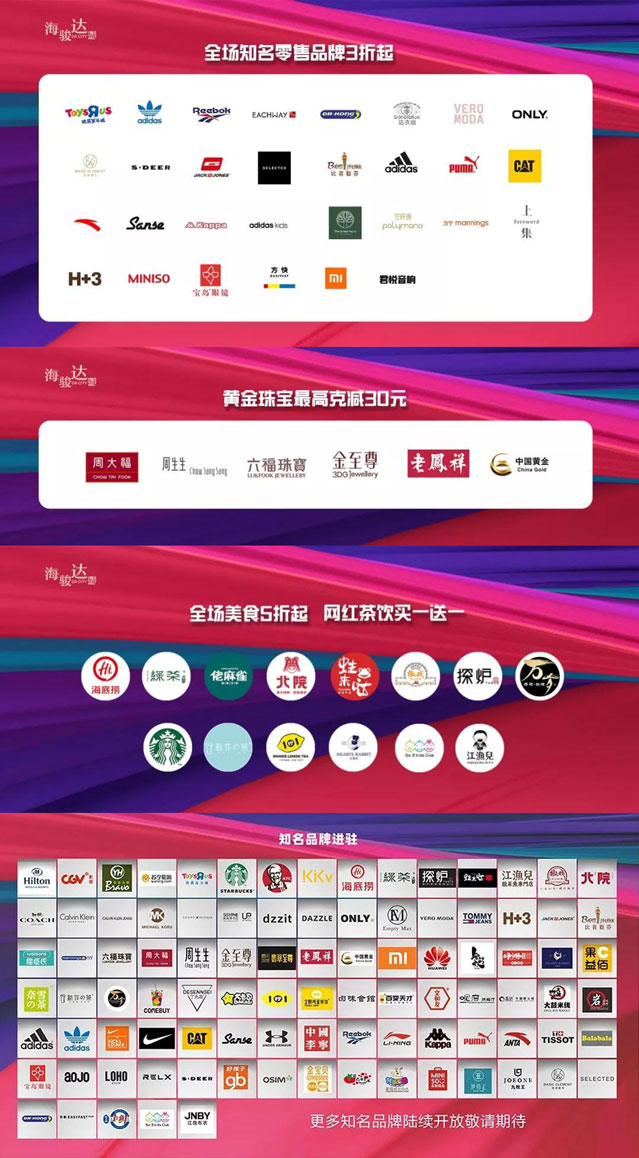 除了各种活动外,海骏达城在开放当天还联合各大品牌商家实行多重优惠重磅输出,钜惠全城。转发有礼,会员专享积分,零售品牌全场最低3折,餐饮品牌全场最低5折,黄金最高克减30元等。其中,玩具反斗城满200送100、满100减50;VERO MODA全场5折起;Adidas originals全场8折;金至尊彩金钻石满1000立减300;海底捞送送菜卡;椒戏酸菜鱼5折……吃喝玩乐购,应有尽有,一应俱全,瞬间满足。