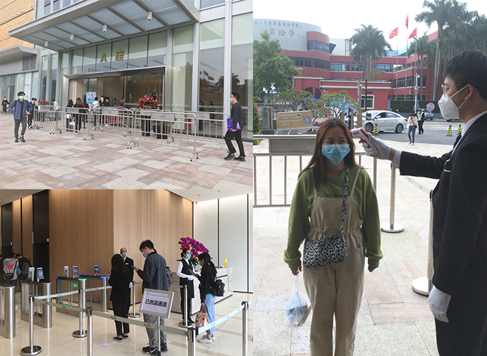 (每个入口实施人流管控,引导人员分流、避免交叉感染、保持一米的安全距离)