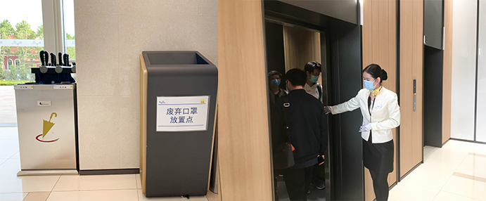 在一楼大堂设有“废弃口罩”专用垃圾桶,将废弃口罩与其他垃圾分类隔离处理,物业人员定时消毒