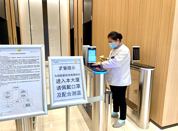 物业保洁人员对大堂、前台、人脸识别闸机等公共区域进行消毒,细化消杀程序,注重写字楼电梯轿厢、垃圾箱,卫生间进行重点深度消杀